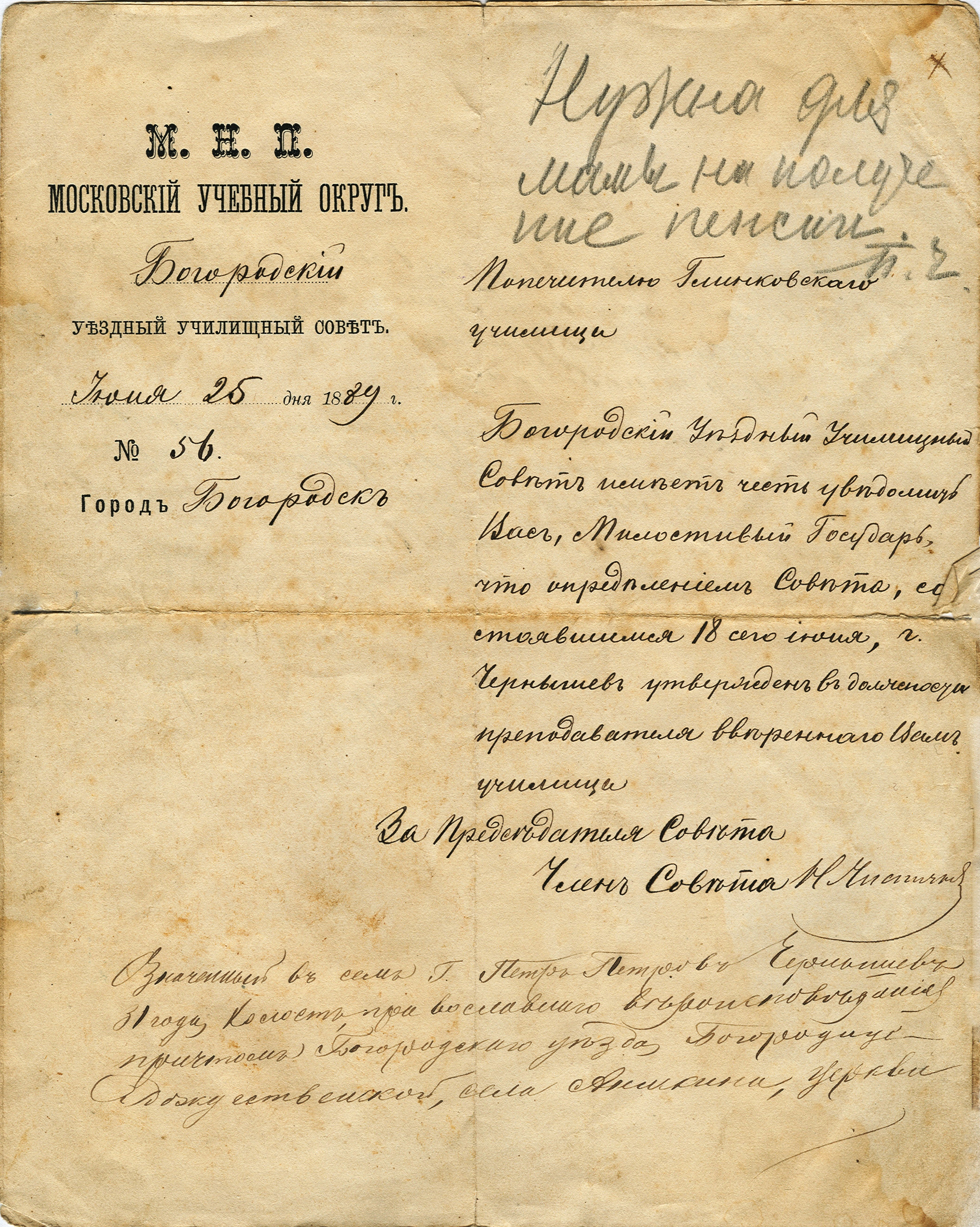 Дед моего отца, Пётр Чернышёв был мещанином города Рыбинска на Волге. Вероятно, он рано ушёл из жизни, так как его супруга Олимпиада Степановна (1830е – 1905-10) с двумя детьми, Петром и Варварой, переехала в 1860х годах в Восточное Подмосковье, в д. Глинки Богородского уезда. Глинки это подмосковная усадьба знаменитого Брюса. Он был сподвижником Петра 1, военным артиллеристом, учёным естественником, математиком, и значительно опередил в своих изысканиях науку своего времени. За полтора столетия после него усадьба поменяла нескольких владельцев (искателей сокровищ Брюса, по местной легенде; все они довольно быстро трагически заканчивали свою жизнь за этим занятием). Олимпиада Степановна служила в доме коммерсанта Лопатина, а дети учились в Богородской гимназии. Уездный центр Богородск был после революции переименован в Ногинск.