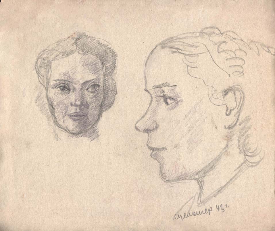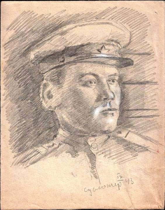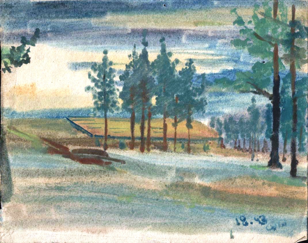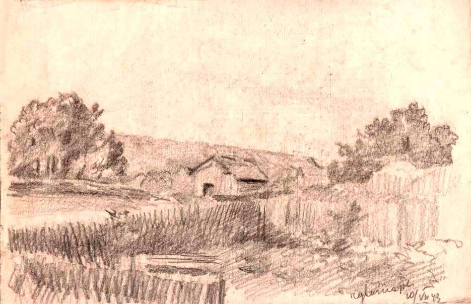 22 сентября 1943 г. «22 / 1Х 43 г. Так я тогда и не написал ничего. А пять дней пролетели так быстро, что я удивился. Мы делаем срочную работу – карту хода военных действий. А вечером не было света. Ты хочешь зарегистрироваться, так сказать, законным браком. Я ничего не имею против, только никак не соберусь посоветоваться с одним знакомым юристом, как это сделать. Сам я не знаю. А он – большой человек, начальник штаба, и его трудно поймать наедине, так как это – личный вопрос. Какое это имеет значение – я не знаю, но ты, наверное, имеешь какие-то неудобства. Так что я целиком иду навстречу. Ну, Мама уехала. Тебе, наверное, еще труднее в смысле хозяйственном… Сегодня закончил с обжигом и запатинировал под бронзу свою последнюю статуэтку. Они почти профессиональны. А в некоторых отношениях, композиции и живости движения, — лучше многих виденных мною. Но, к сожалению, приходится их отдавать в неверные руки. Сейчас, вечером, наклеил бумагу для эскиза. Завтра, если будет свет, начну работать, голова уже занята этим, и хочется скорее посмотреть, что из этого выйдет. И вообще мне снова хочется работать. Хочется мне еще написать пейзаж с озером и сухими стволами деревьев, а по земле растут иван-чай и мох-ягель. И еще два пейзажа, о которых я тебе писал. Наталка, что тебе делать с печкой, с козой и другими делами – я не знаю, что посоветовать. Я и раньше был непрактичным, а теперь и совсем нереальный человек. Ну, я спешу закончить письмо. Сейчас погаснет свет. Может быть, допишу завтра утром. Кругом меня горячо обсуждаются последние известия: Чернигов, Гомельское направление и другие. Мне не хочется их обсуждать, я не очень оптимистически настроен на скорый конец войны. Это будет еще длинная и тяжелая история. А скорый и хороший конец всем приятен, и я тоже буду очень рад, как и все, если война скоро закончится. Ну, до свидания. Как-нибудь карабкайся и крепись, и вообще не унывай. А старайся жить и в этих условиях; ведь ты знаешь, что и до войны большинство людей жили так, как ты сейчас живешь – без творческой работы, без перспектив. Будь здорова, целую крепко. Папка. Уже ясное осеннее утро 23 сентября».