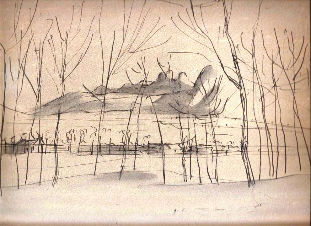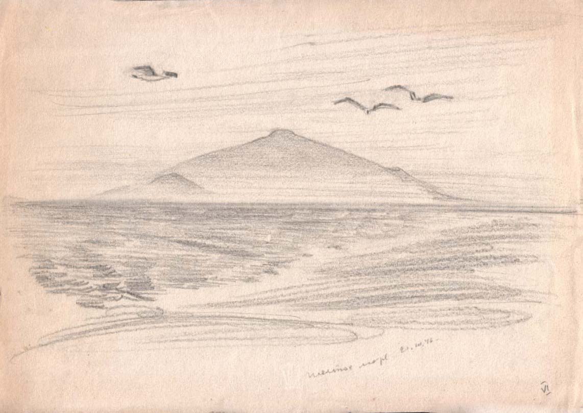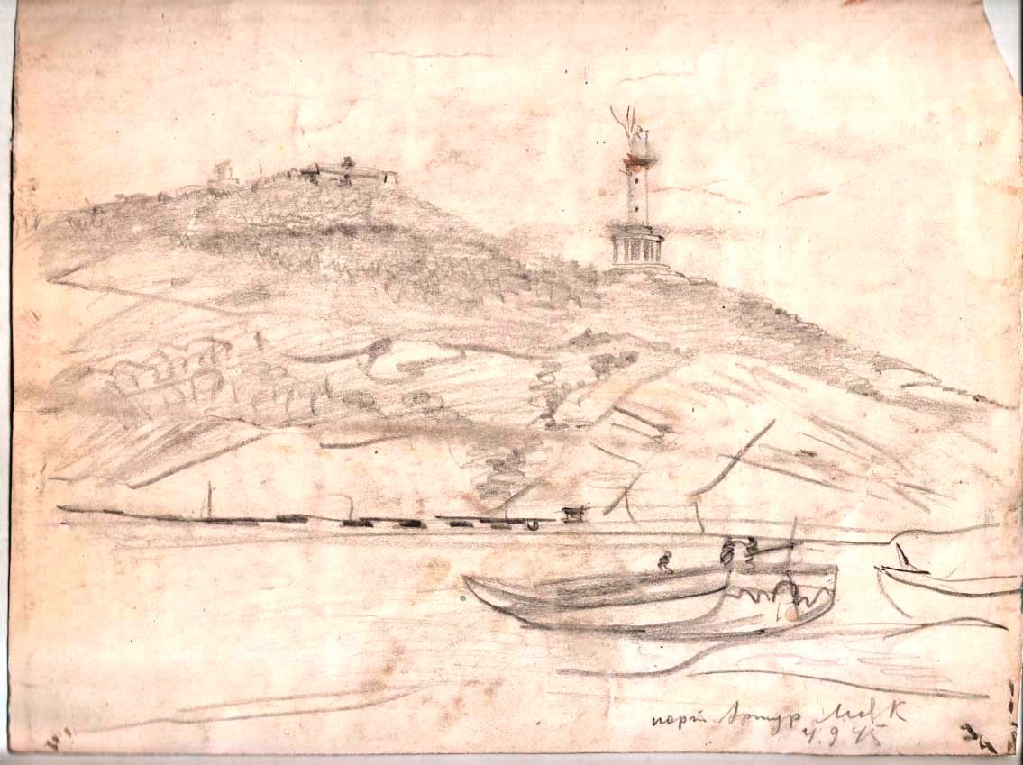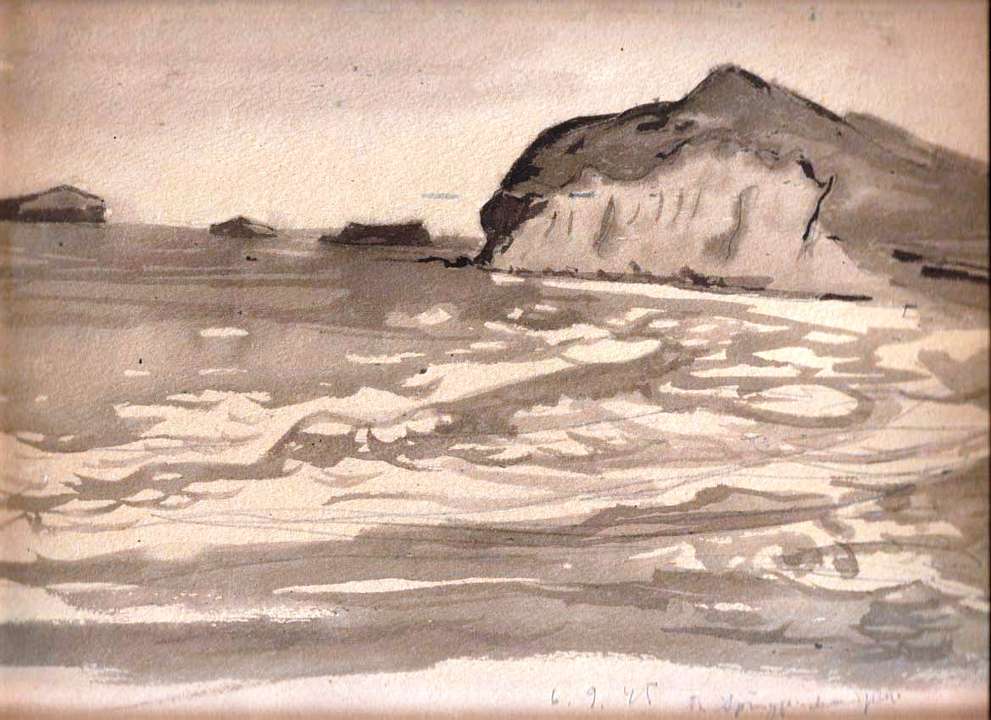 «12.8.45. Манчжурия. Здравствуй, Наталка! Путешествие продолжается по южным склонам Хинганского хребта. Места пустынные и дикие. Очень красивые горы, покрытые бархатным ковром степной травы. Но здесь есть уже речки и озера. В долинах - обилие цветов. Иду хорошо. Предоставлен почти целиком самому себе. Делаю беглые зарисовки. Но марши утомительны – 50-60 км в сутки. Но чувствую себя хорошо. Вчера даже взобрался на небольшую гору; там растут березы, дикие абрикосы и грибы – подберезовики, волнушки и белянки. Это очень трогательно после месяцев голых степей. Идем без боев, но скоро ли кончится эта одиссея, и где и как - трудно сказать. Будем надеяться, как говорится, на Бога. Письма твои получаю регулярно на 12 – 15 день. Сделал несколько этюдов клеевыми и акварельными красками в своей обычной для военного времени манере. Пока я их везу на повозке с разными другими вещами. За письма твои большое спасибо. Они меня переносят к вам, на Волхонку. Ну, пока все, кончаю. Еще очень много хотелось бы сказать, но необходимо спешить все вперед и вперед. Целую крепко всех. Ваш папка Борька. У меня выросли большие-большие рыжие усы».