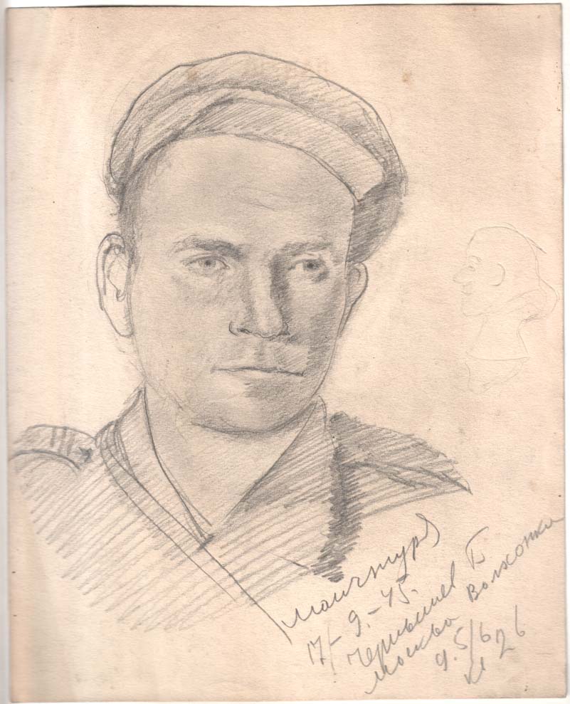 … И я снова сделал предложение о росписи и начал работать. С этого началась моя «слава» по полку и по бригаде. Сделал я много. И много хорошего и интересного, даже невозможно всего оценить. Этот период с 22 апреля до конца августа был одним из самых прекрасных периодов в моей жизни. Я все время писал с непрерывным успехом, пользуясь всеобщим уважением. Имею 3 благодарности по полку, одну от командира бригады и Грамоту от Верховного Совета Чувашской АССР, правда, мне ее еще не вручили. Ну а потом я уж забыл, что было: меня отправляли в строй, потом опять на работу. И вообще отношение изменилось, от былого величия не осталось следа. Вчера может быть в последний раз посмотрел свои росписи, и поразила меня их несовременность, в смысле того, что они просто прекрасные жемчужины, но среди холода, грязи и ругани совсем чужие, какие-то невинные девушки среди всеобщего разврата и упадка. А сейчас там коптят коптилки, дымят печки, брызгают грязью при мытье полов. Но ты думаешь, мне это больно? Нет, нисколько. Ты ведь знаешь мой характер, я смотрю на это как на неизбежное. Вот я здесь расписал 4 ленкомнаты и лестницу. В том числе 5 интересных плафонов, 2 больших композиции – Кутузов и Суворов, и много разных других вещей, просто трудно сосчитать. Об этом я писал тебе. В общем, здесь сделано вдвое больше, чем за всю мою жизнь, а может быть и больше. Написал я много и этюдов, и маслом, и акварелью, и два портрета маслом. За последнее время я сделал 5-6 скульптурных фигурок. И моя деятельность оборвалась на группе «моя семья», что я делал в Москве из гипса. Большинство своих работ я раздарил, а кое-что оставил у знакомых. Адреса их я тебе сообщал…
