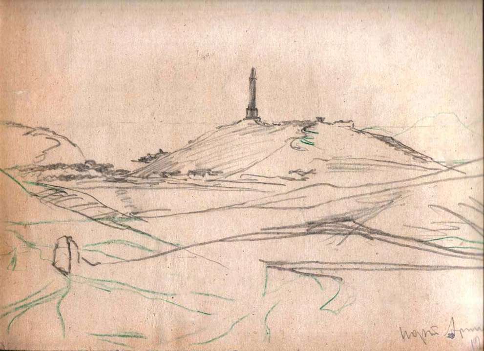 Теперь по части моих последних этюдов. Я их оставил у Григорьевых. Они их тебе привезут, или когда у тебя будет время, ты сама съездишь. Это, конечно, не обязательно, там ничего особенного нет. А голову Александра Невского, что мы с Марком закопали, найти так: со ст. Алабино нужно дойти до Санчасти вдоль речки, пройти мимо землянки, где ты у меня ночевала, и идти к лесу близ речушки. Там, идя вдоль речки, будет просека, которая пересекает речку. За просекой, на берегу речки в 100 – 150 м. поляна, уютная такая, на ней мы жгли костер. На берегу растут 2-3 большие густые елки с ветвями до земли. Вот между елок и лежит эта скульптура. Вот когда у вас будет время, вы съездите на экскурсию в это место.