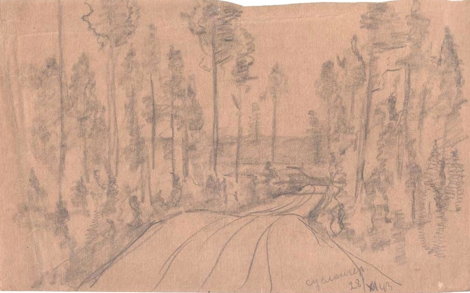 Цивильск. 24 января 1942 г.«Наталка, здравствуй! Пишу из г. Цивильска Чувашской АССР, но скоро, наверное, буду отправлен на фронт. Прошло уже месяца четыре, как я не получал ниоткуда писем, так что ничего не знаю, где вы и что с вами, и от тебя ничего вообще не получал. Но я уже привык ни о чем не думать и не скучать. За время пребывания в Цивильске, я работал художником в клубе полка и даже успел сделать эскизы оформления клуба. Часть работы уже выполнена, я начал расписывать плафон. Но дописать, по-видимому, не удастся, — очень трудные условия: днем нет света, а вечером клуб занят. Но начал я хорошо. … Очень бы хотелось переслать тебе мои эскизы плафонов и панно. Панно – на тему «Александр Невский» и «Кутузов». Панно я не начинал, а Кутузова пришлось отдать Шугрину, он способный и ловкий художник, по мосховски. Но я очень рад, что мне все-таки удалось поработать. Стоят сильные морозы, и часто думаю о ребятишках. Где-то вы живете? Перед отправкой на фронт напишу еще через Томск, как мы условились, на Берникову. Слышал, что В.А. Фаворский с семьей уехал в Самарканд. Больше я ничего не знаю…В Москве, говорят, жизнь более или менее нормальная, но туда никого не пускают. Ну, живу я ничего, чувствую себя хорошо, здоров. Хотелось бы посмотреть на вас всех, но это невозможно, да я, признаться, стараюсь не расстраиваться. Надеюсь на тебя и Маму – вы сделаете все, что возможно. Глядя на здешних эвакуированных, их здесь много, — кое-как жить можно. Ну, всего хорошего. Целую всех. Скоро весна, будет теплее и станет легче. Обо мне не беспокойтесь, я все переношу сравнительно легко. Болел немного живот – объелся картошки во время ночевки в чувашской деревне. Ну, будьте здоровы, пишите. 24/1 42г. Папка. Г. Цивильск Чувашской АССР, п/я 072/25, или до востребования».