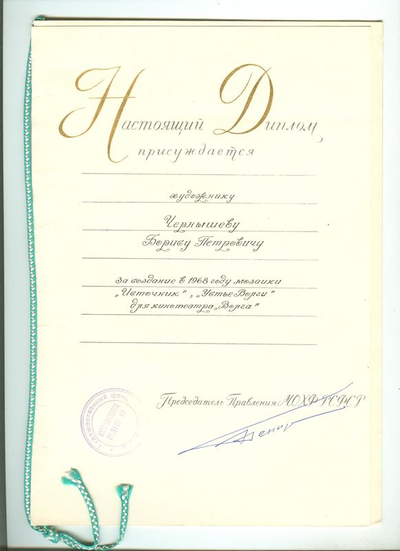 Работа по оформлению фойе кинотеатра велась в соавторстве с художниками Александрой Лукашевкер и Тамарой Шиловской. Чернышевым были выполнены грандиозные панно на трех расположенных на расстоянии стенах, которые он сумел объединить ритмом и общей, несмотря на монументальность, живописностью. Эта живописность создается свободным чередованием разного размера камней, тщательно подобранных мастером.